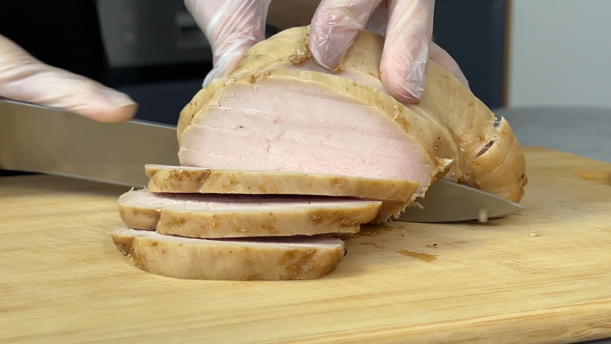 За 10 минут до окончания запекания, когда температура внутри мяса достигнет около 75°C, следует аккуратно открыть фольгу и смазать буженину остатками маринада для получения красивой корочки. После запекания мясо оставляют в фольге для остывания при комнатной температуре, а затем ставят в холодильник на ночь. Это гарантирует плотную нарезку и насыщенный вкус.