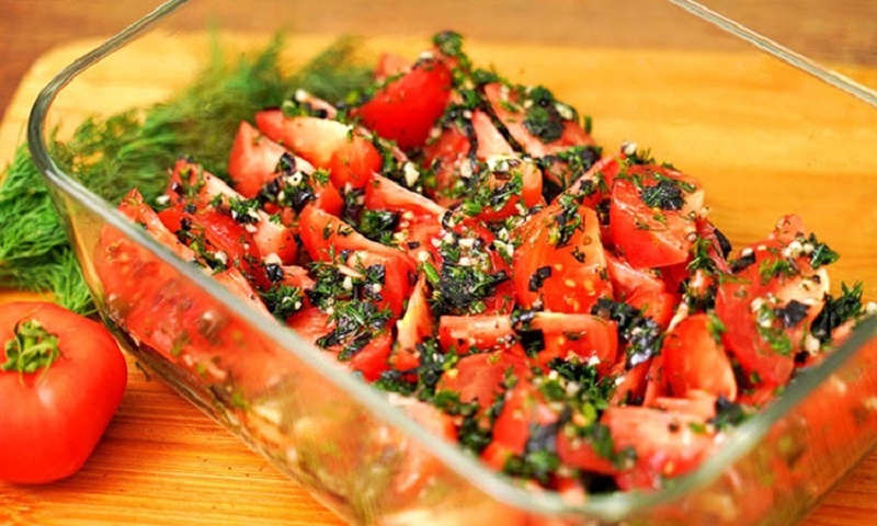Заправка, состоящая из растительного масла, уксуса, сахара и чеснока, придаст салату уникальный вкус. Важно перемешивать ингредиенты по слоям, чтобы все вкусы лучше сочетаются. Сначала заложите половину лука и укропа, затем помидоры, после этого перец и вновь повторите слои, завершив оставшейся заправкой.