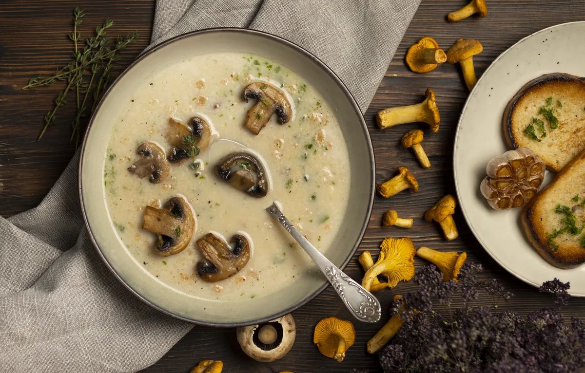 Глубокий грибной характер рождают разные виды грибов: шампиньоны, лисички или белые. База — мягкое луковое тепло и картофель, чтобы суп держал форму и позже превратился в бархатное пюре. Сливки добавляют нежности, а лёгкая нотка мускатного ореха подчёркивает глубину вкуса.