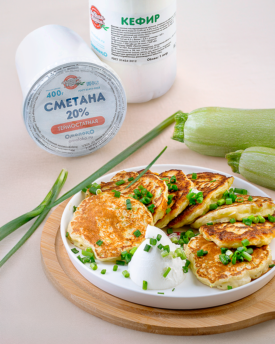 Подача: горячие оладьи подаются с густой сметаной от «Чистой Линии». Наслаждайтесь этим лакомством в кругу семьи и друзей!
