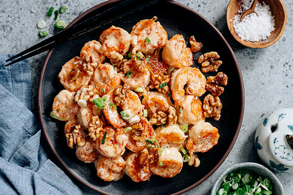 5. Финальная сборка: Поместите креветки в миску, добавьте соус и осторожно перемешайте. Затем добавьте половину карамелизированных орехов, перемешайте и выложите на подачу, украсив оставшимися орехами и зелёным луком.