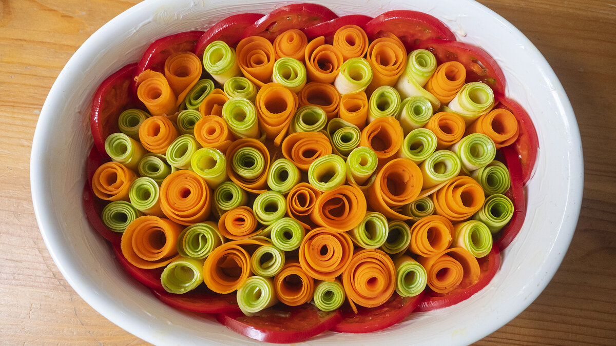 Начать стоит с нарезки моркови и кабачка. С помощью овощечистки их следует нарезать тонкими лентами. Затем нужно смазать форму для запекания растопленным сливочным маслом. Томаты нарезаются кружочками, после чего их аккуратно располагают по краям формы, укладывая внахлест.