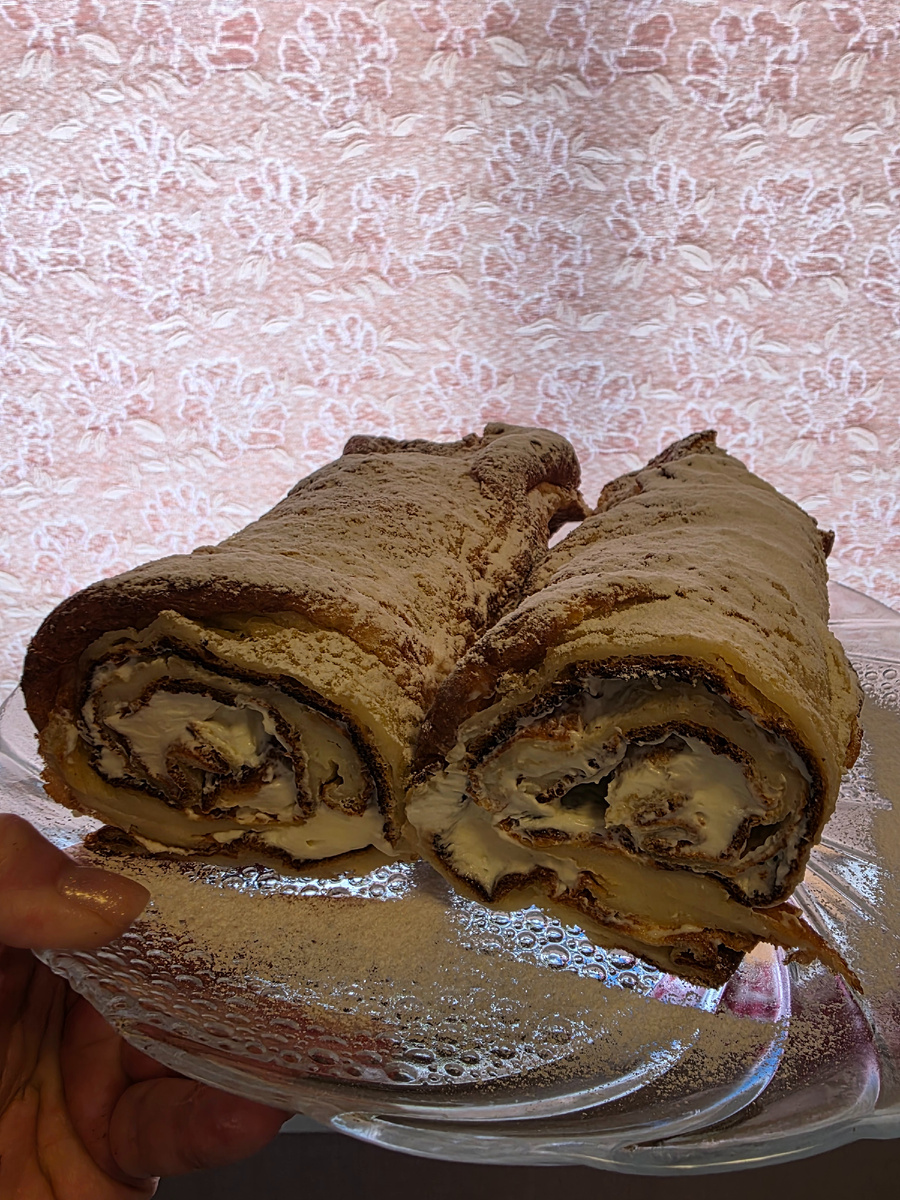 После того как блин остынет, его нужно промазать кремом и аккуратно свернуть в рулет. Как завершающий штрих, посыпьте сверху сахарной пудрой для дополнительной сладости.