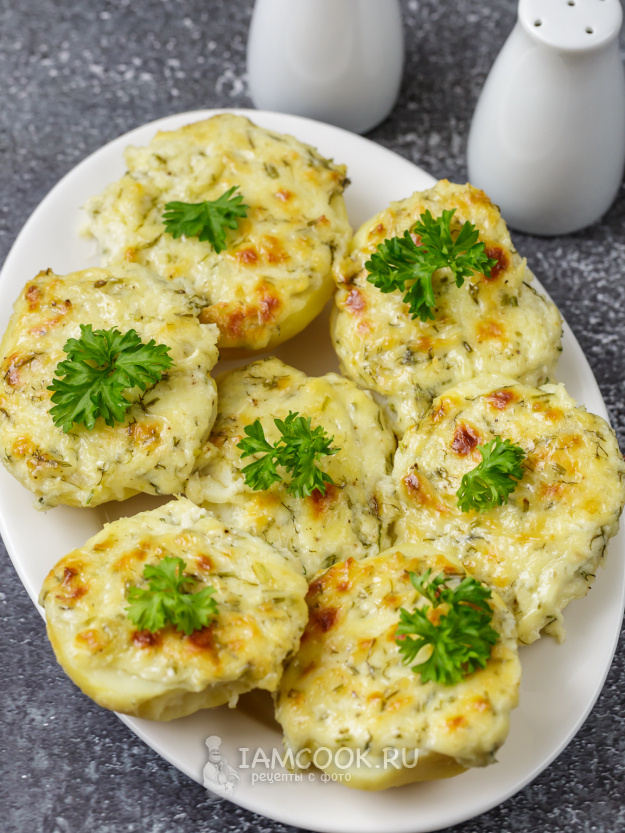3. Когда картофель будет готов, очистите его от кожуры (по желанию) и разрежьте пополам. Уложите половинки срезом вверх на противень, слегка посолите и щедро выложите сырную массу сверху.