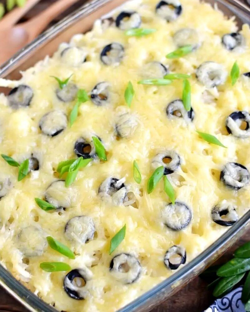 Тыльной стороной ложки выравниваем поверхность запеканки. Поверх натираем сыр Чеддер и украшаем кружочками черных маслин по вкусу.