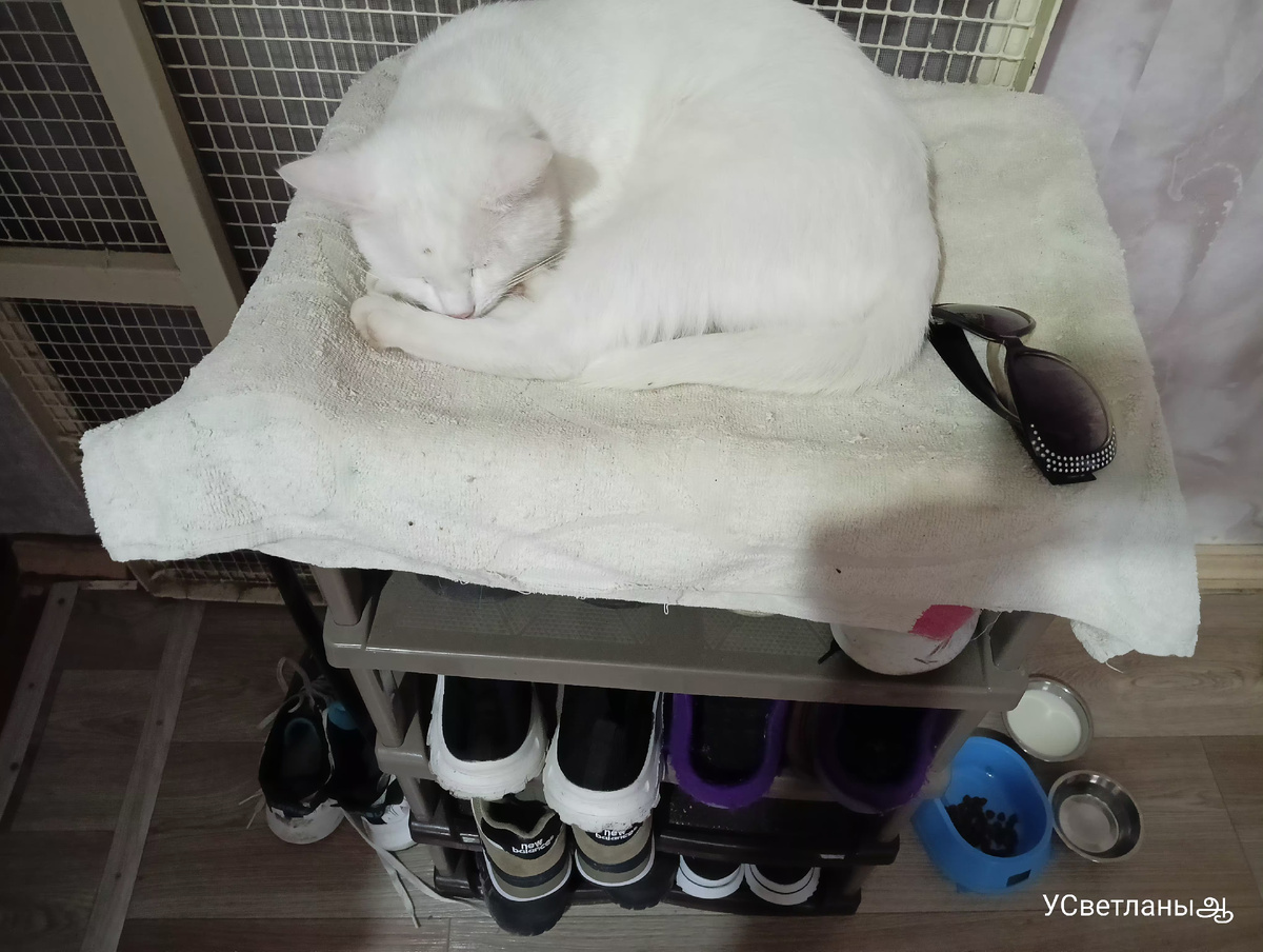 Тем временем, домашние питомцы наслаждаются утренним сном: бельчонок уютно устроился на обувной полке, Василиса разместилась на комоде в зале, а Машенька уютно расположилась в спальне.