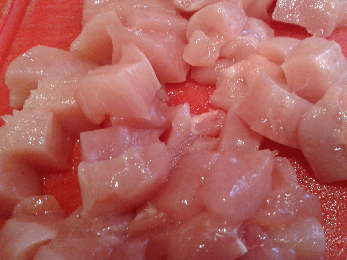 Кабачок, куриное мясо и лук обжариваются на сковороде с маслом, приправляются и охлаждаются.