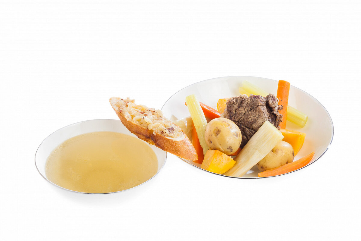 Потофё подается изысканно: на поджаренный хлеб намазывается костный мозг, в большие тарелки выкладываются вареные овощи и кусочки мяса, а в небольшие глубокие тарелки разливается насыщенный мясной бульон. Такое блюдо создаст атмосферу настоящего французского праздника на вашем столе!