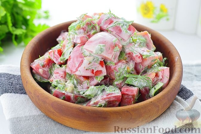 - Салат из помидоров с чесноком и зеленью: Нежные грунтовые помидоры в сочетании с ароматной зеленью и чесноком создают свежий и яркий вкус. Можно заправить как сметаной, так и растительным маслом для разнообразия.