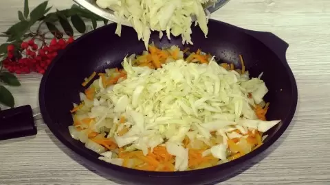 - Совместите с нашинкованной, мятой и слегка подсоленной капустой, жарьте на среднем огне около 5 минут.