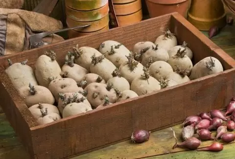 Отобранные клубни следует раскладывать в один слой в ящики или на стеллажи, после чего разместить их в помещении с рассеянным светом, где температура будет поддерживаться в пределах +12–15°C. Периодически клубни следует переворачивать, чтобы ростки развивались равномерно. За 30–40 дней картошка сформирует крепкие зеленые или фиолетовые ростки длиной 1–2 см, готовые для посадки.