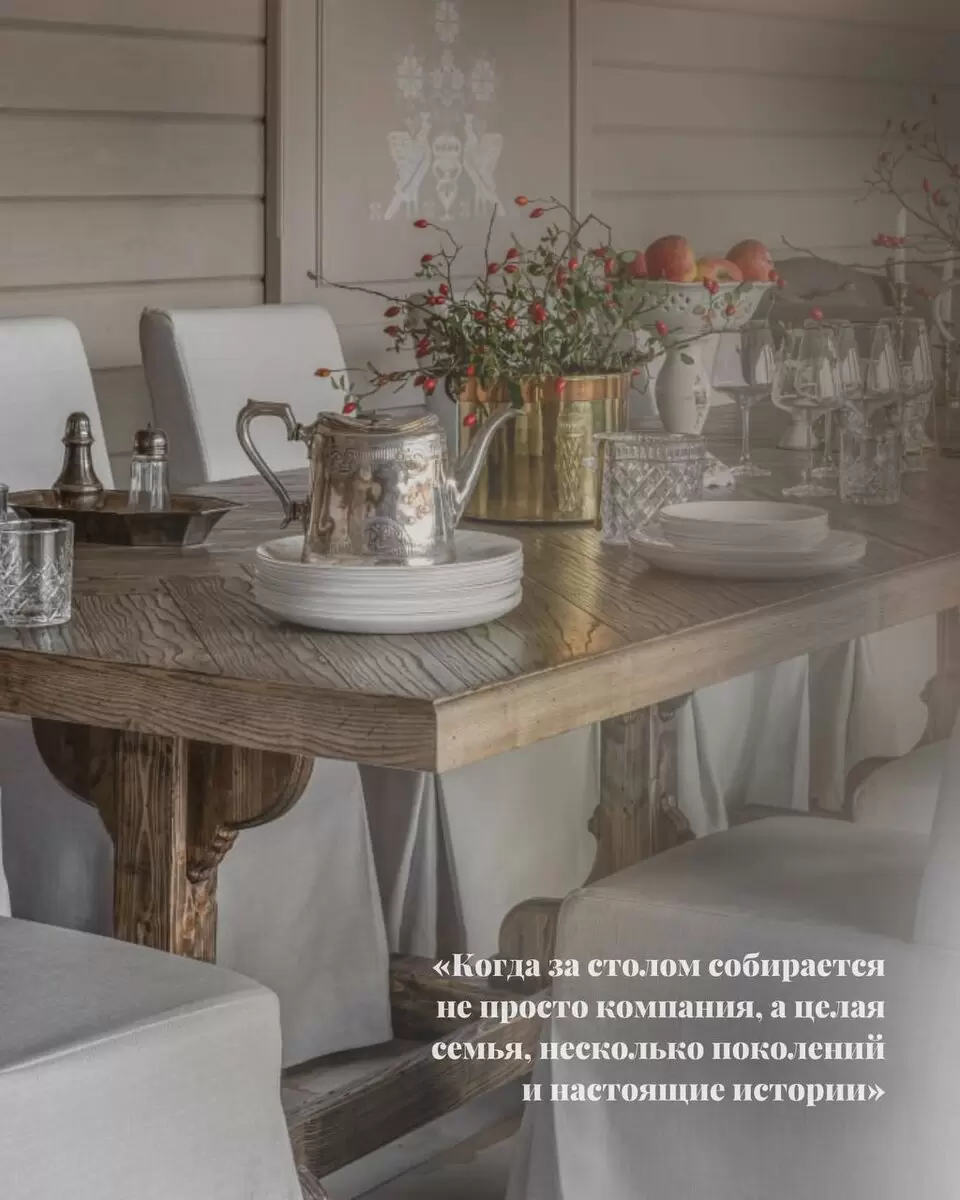 На иллюстрации представлен самый длинный стол в проекте известного дизайнера Анастасии Сафоновой. Этот проект стал настоящим символом уюта и единства, подчеркивая важность общения среди близких людей.