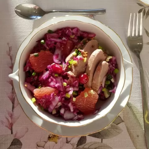 На столах гурманов и ценителей здоровой пищи этот салат станет настоящим открытием. В его составе сочная красная пекинская капуста, освежающий грейпфрут с легкой терпкостью и клюква, придающая блюду искрящуюся нотку. Ароматная утка и зелёный лук не только добавляют ярких красок, но и делают салат изысканным.