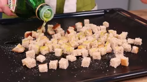 Отправьте сухарики в предразогретую до 200 градусов духовку на 7 минут. Затем аккуратно переложите их на тарелку, чтобы они не подгорели на горячем противне. Учтите, что духовки могут различаться, поэтому следите за сухариками — они должны быть румяными и хрустящими, чтобы впоследствии не размокли в салате.
