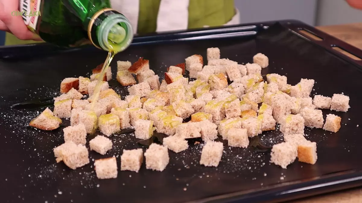 Первым шагом станет приготовление сухариков. Для этого идеально подойдет пшенично-ружаной или ржаной хлеб. Нарезать его следует кубиками, включая корочку, которую можно не убрать. Разложите хлеб в один слой на противне, затем придайте ему вкус, посыпав солью, черным перцем и полив оливковым маслом или подсолнечным, по желанию. Все смешайте руками.