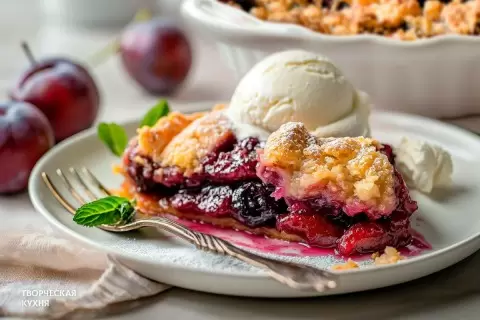 С сливовым крамблом можно экспериментировать, добавляя свежую мяту или подавая его с ванильным мороженым, что станет отличным дополнением к сладкому угощению.