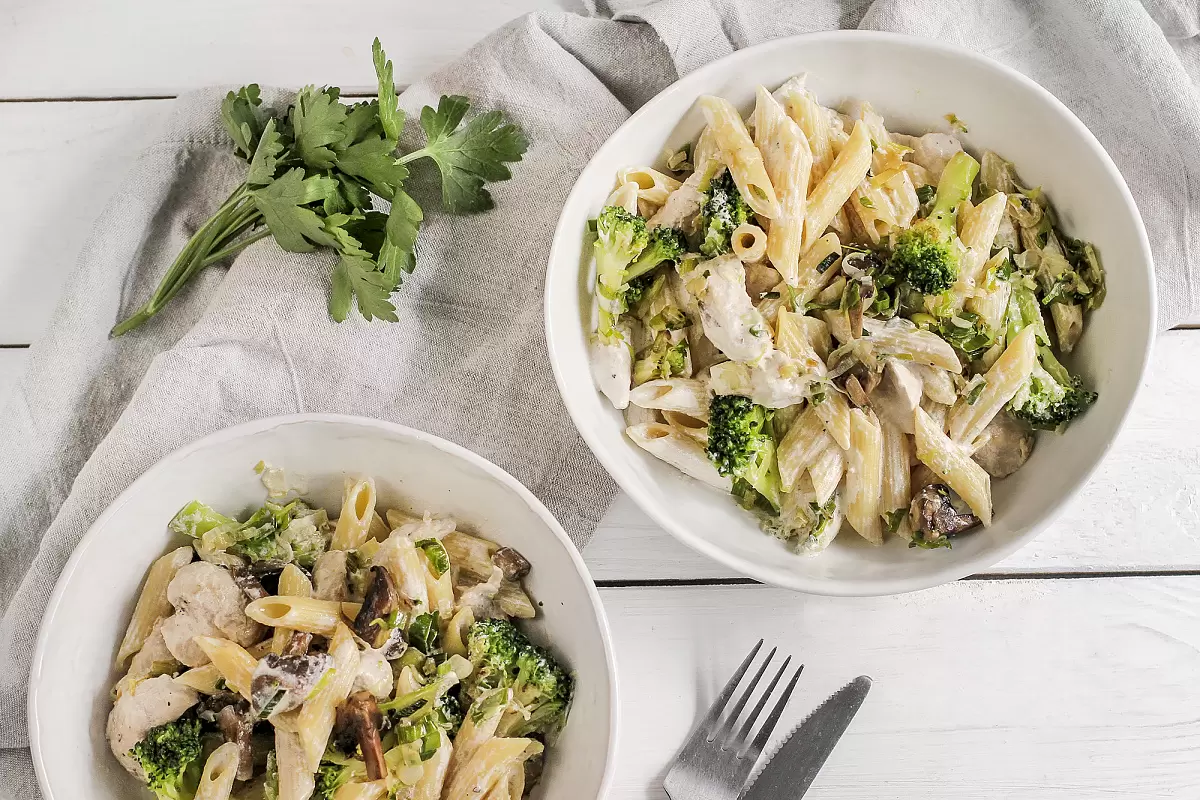 Вскипятите 1,5 литра подсоленной воды.Отварите пасту пенне в течение 8-9 минут, затем откиньте на дуршлаг.Подготовьте лук-порей, нарезав его полукольцами и предварительно промыв.Разберите брокколи на соцветия.Очистите шампиньоны, нарежьте дольками.На сковороде разогрейте смесь сливочного и растительного масла. Обжарьте лук-порей около 2-3 минут до мягкости.Добавьте брокколи и готовьте еще 2-3 минуты, затем введите грибы, приправьте солью и перцем, и жарьте всё вместе еще 2-3 минуты.Переложите овощи на тарелку и приступим к мясу. На той же сковороде обжарьте индейку на сильном огне в течение 4-5 минут, приправив солью и перцем.Верните овощи на сковороду, уменьшите огонь до среднего, влейте сливки и готовьте, не допуская кипения, до загустения соуса.Добавьте пасту к индейке и овощам, перемешайте и прогрейте на медленном огне около 1 минуты.Паста Альфредо с индейкой подается горячей, на столе создавая атмосферу уюта. Приятного аппетита!