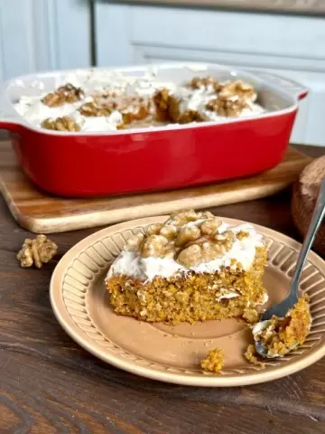 После выхода кекса из духовки дожидаются его полного остывания, а затем можно украсить нежным творогом из топленого молока, добавив сверху грецкие орехи для дополнительных текстурных нот.