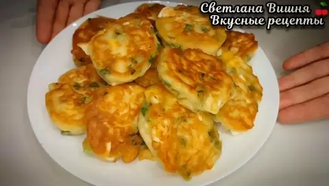 Смешайте яйца и лук с тестом и перемешайте. Разогрейте сковороду с растительным маслом. С помощью ложки выкладывайте тесто на сковороду и обжаривайте с обеих сторон до золотистой корочки. Жарьте на среднем огне, не забывая переворачивать пирожки, чтобы они равномерно пропеклись.