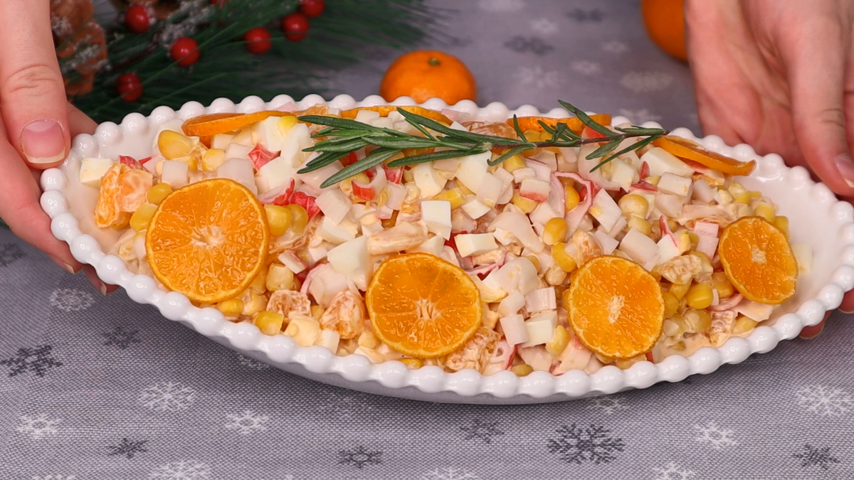Этот салат легко украсит любой праздничный стол, добавив в него наивкуснейший мандариновый штрих. Нежные и освежающие цитрусовые ноты идеально гармонируют с крабовыми палочками и сладкой кукурузой, предлагая настоящий гастрономический взрыв!