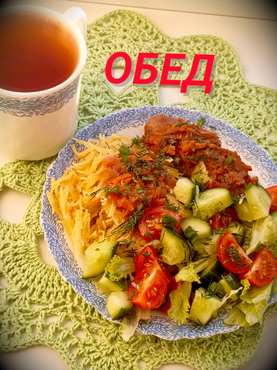 Сегодня на обед была накрыта настоящая кулинарная симфония, где остатки домашних блюд стали настоящей находкой. Перед трапезой было выпито стакан горячей воды, что стало отличной подготовкой для желудка. На тарелке завершилась вермишель с домашними колбасками, дополненная яркими и свежими овощами: сладкими черри, хрустящим огурцом и нежными листьями салата, щедро укрытыми душистым подсолнечным маслом.