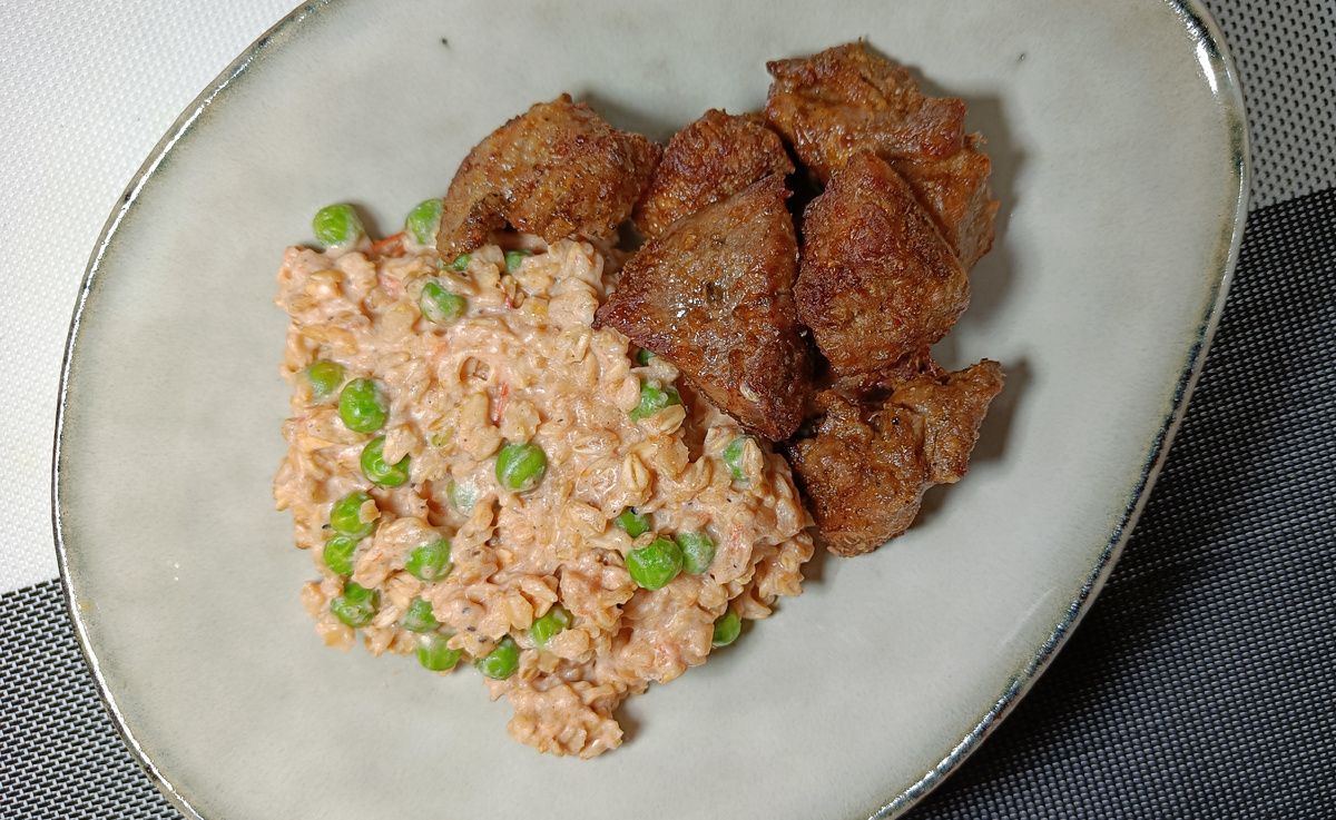 3. Когда овсянка практически готова, добавьте зелёный горошек и рикотту, тщательно перемешайте и придайте вкус с помощью любимых специй.