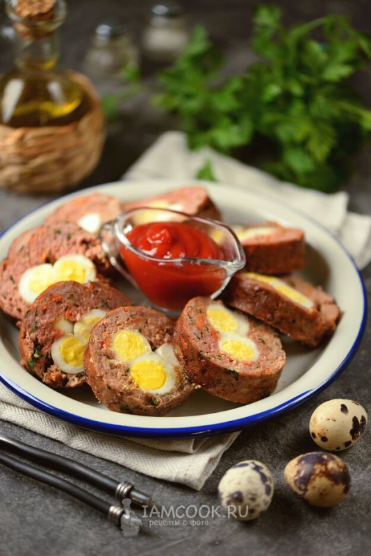 5. На фольгу выложить мясную массу слоем 1-1.5 см, сверху разместить перепелиные яйца и аккуратно скатать рулет.