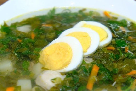 Мелко нарежьте щавель и крапиву (действуйте осторожно, лучше всего в перчатках, либо обдайте кипятком). После завершения варки бульона, извлеките мясо, лук, чеснок и перец, затем добавьте картофель в бульон. Варите его до мягкости, около 10 минут.