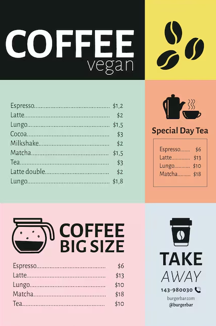 Формат зависит от концепции. Для кофеен с самообслуживанием подойдёт доска, а для заведений с обслуживанием лучше выбрать печатный или электронный вариант. При создании дизайна меню важно учитывать: