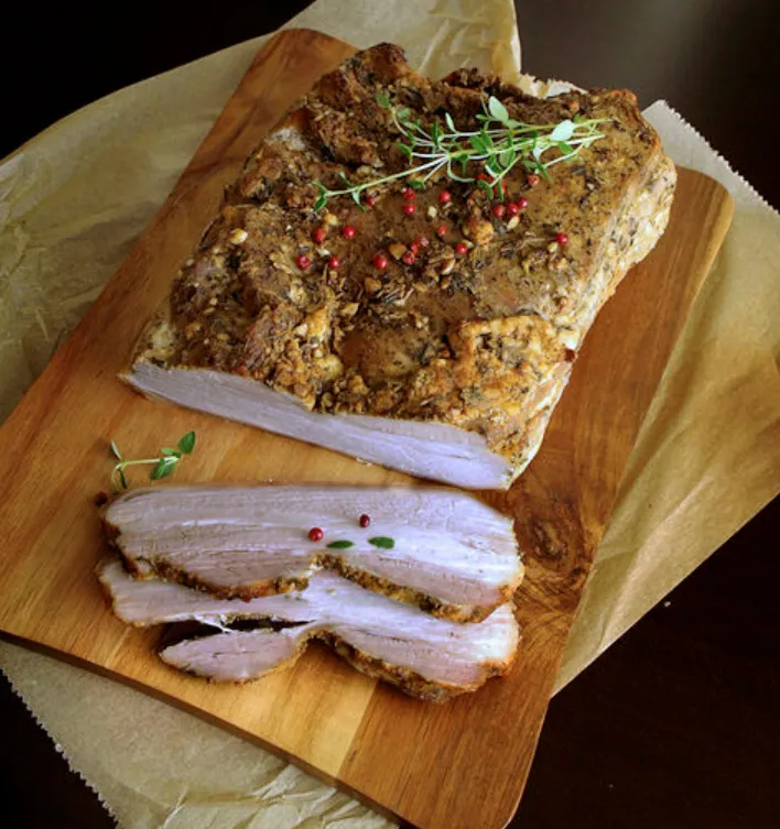 Затем натрите свиную грудинку этой смесью, избегая попадания на кожу. Заверните мясо в пленку и уберите в холодильник на 7-10 часов. Такой маринад позволит мясу пропитаться ароматами и станет справжней находкой для всевозможных бутербродов.
