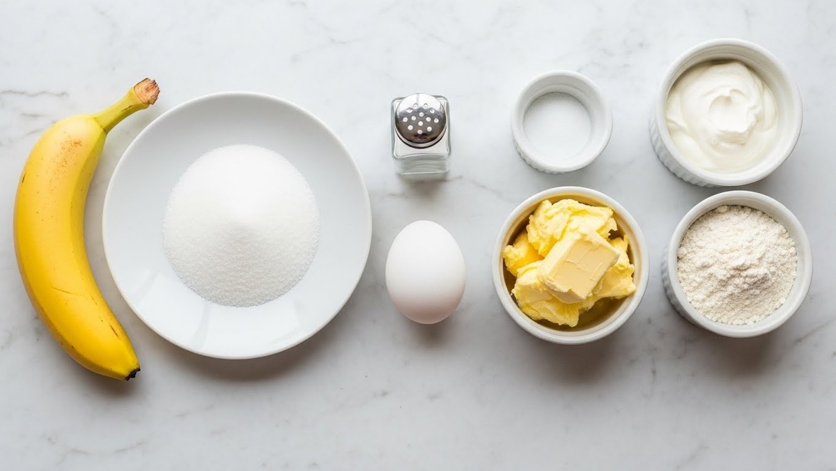 Помойте и очистите банан, затем нарежьте его на кусочки и положите в чашу блендера. Добавьте яйцо, сметану, мягкое масло, сахар, соль и ванильный сахар. Хорошо пробейте блендером до однородной массы.