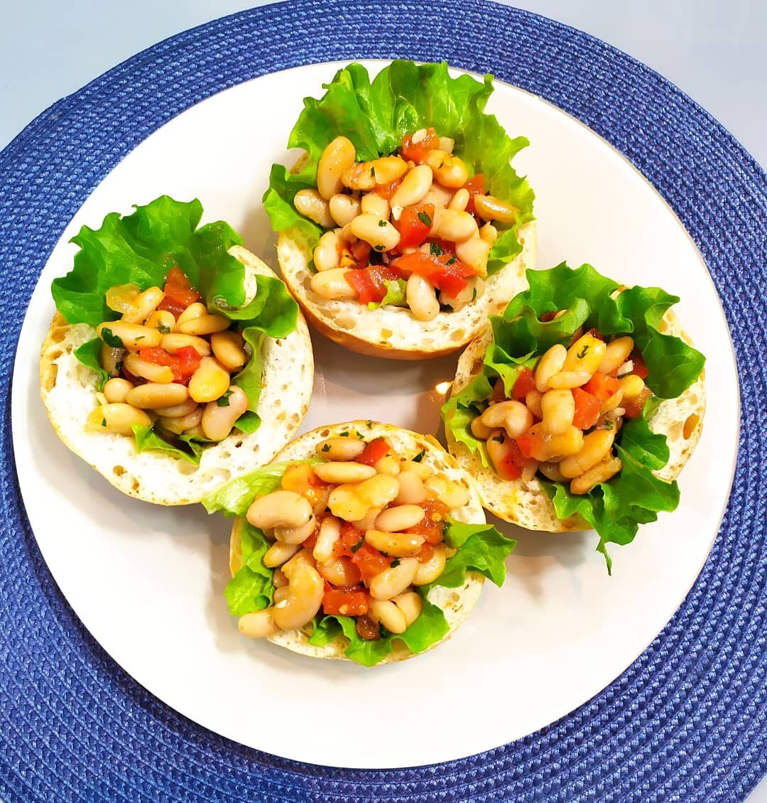 Когда начинка готова, разрежьте булочку пополам. Внутрь положите несколько листьев свежего салата, а сверху выложите ароматную фасолевую массу.