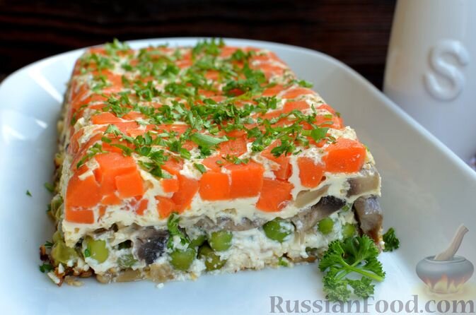 Овощная запеканка с грибами и плавленым сыром: Сочные морковь, горошек и шампиньоны делают это блюдо насыщенным и сытным. Молочно-яичная заливка и плавленый сыр собирают все ингредиенты в единое целое, создавая гармоничный вкус. Ингредиенты: морковь, горошек, шампиньоны, сыр, молоко, яйца, специи.