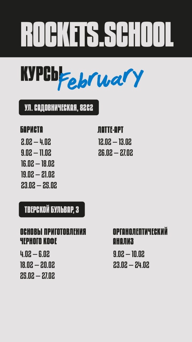 Февраль станет интересным месяцем для всех любителей кофе, так как на сайте rockets.coffee представлено обновленное расписание курсов и мастер-классов. Участники смогут познакомиться с новыми техниками приготовления и узнать секреты бариста.