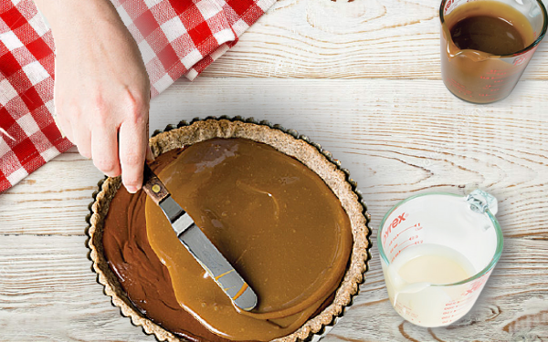 Шаг 1: Нанесите равномерный слой темного ганаша на торт и охладите его на 45 минут для создания надежной основы.