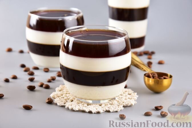 Еще один оригинальный десерт — молочно-кофейное желе. Контраст между кофейным и молочным слоями не только радует глаз, но и удивляет вкусом.