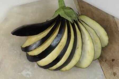 1. Подготовьте баклажаны. Разрежьте их вдоль, не доходя до черенка. Присыпьте солью и оставьте на 20–25 минут, чтобы избавиться от горечи.