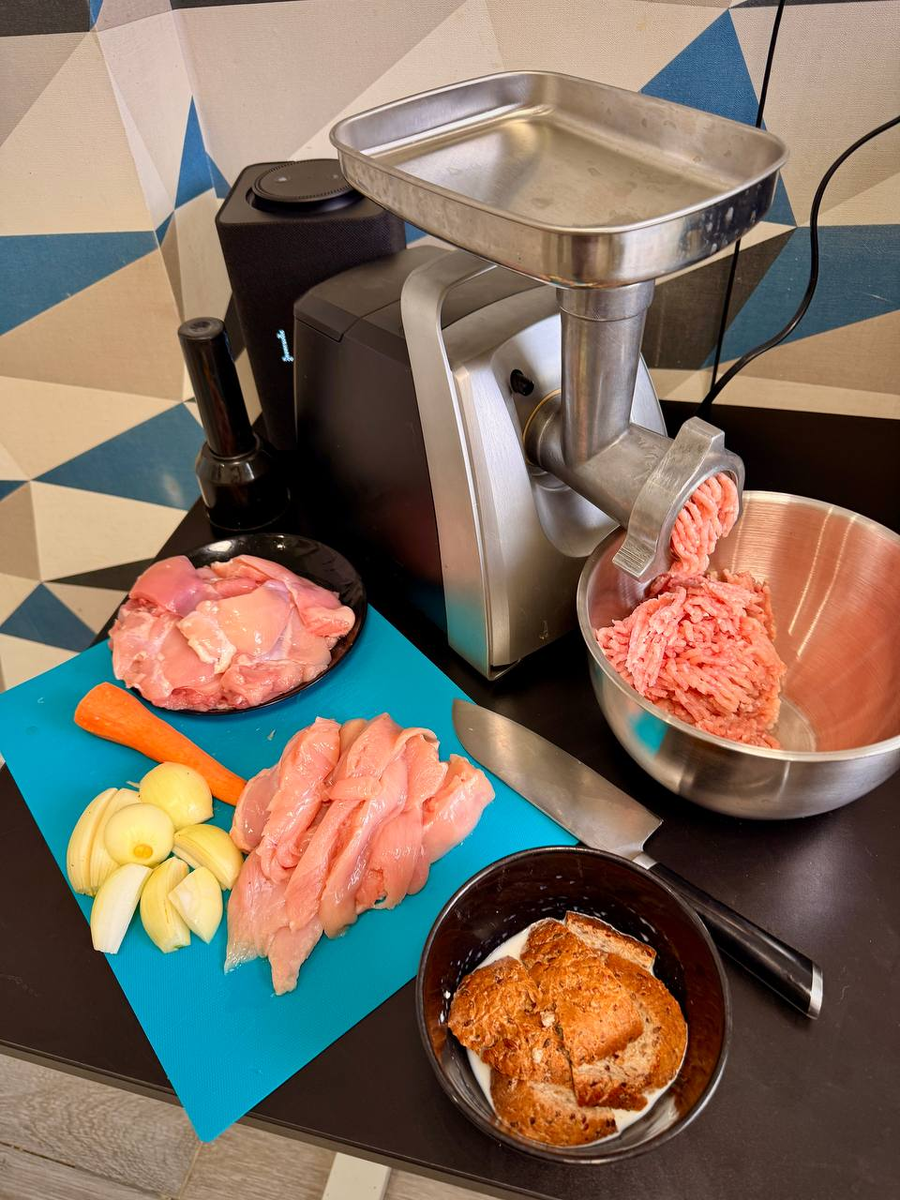 Для создания правильной текстуры, в фарш вошли куриная грудка — для упругости, и бедро без кости — для сочности. Перед измельчением в мясорубке удаляются все хрящики, чтобы котлета получилась однородной. Процесс готовки включает лук и морковь, которые тоже отправляются в мясорубку.
