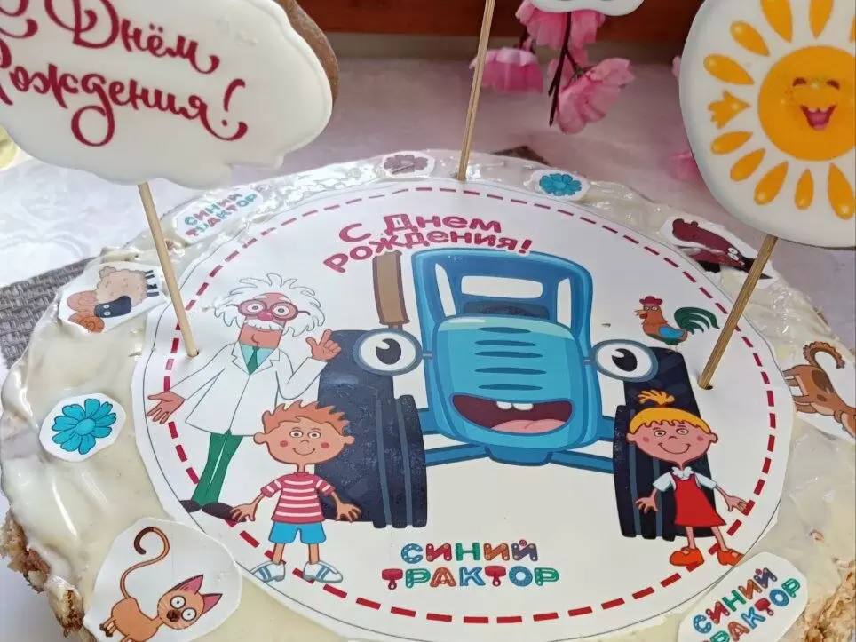 Чтобы удивить гостей, можно создать торт, украшенный в стилистике любимого мультфильма «Синий трактор». Приготовление начинается с простых действий: в большой миске смешиваются 4 яйца и 1,5 стакана сахара, а затем добавляются мед, коньяк, разрыхлитель и ванилин. Получившуюся массу стоит тщательно перемешать, добавляя по мере необходимости 3 стакана муки. Тесто получится немного вязким.