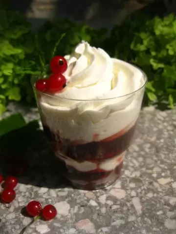 После этого начинается сборка рисунка десерта. На дно стаканчиков укладываются круги или крошка бисквита, которые пропитываются приготовленным сиропом. Затем идет слой смородинового джема, сверху – нежный крем. Рекомендуется повторить слои, пока не исчерпаются все ингредиенты. Завершает композицию аккуратная шапочка из крема, украшенная свежими ягодами и мятой.