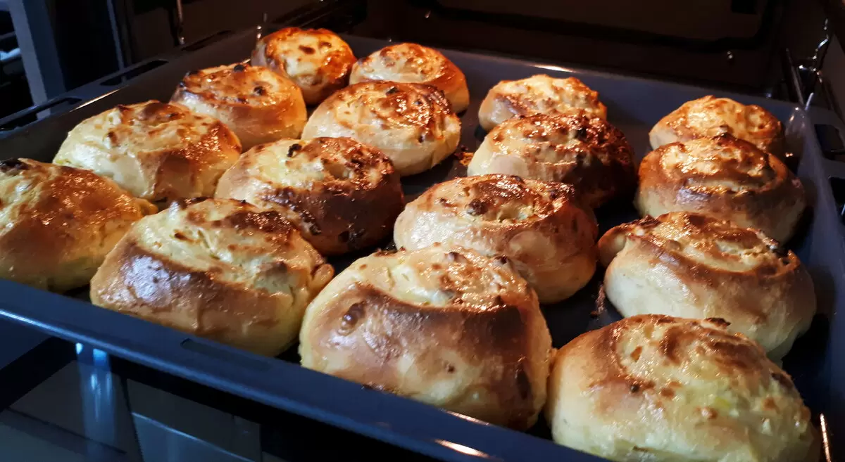 Выпекайте булочки в разогретой до 180 градусов духовке. За 10 минут до завершения выпекания можно смазать их заливкой из сметаны, молока и сахарной пудры для дополнительного блеска и аромата. В конечном итоге получаются легкие, воздушные и очень вкусные булочки с насыщенным вкусом!