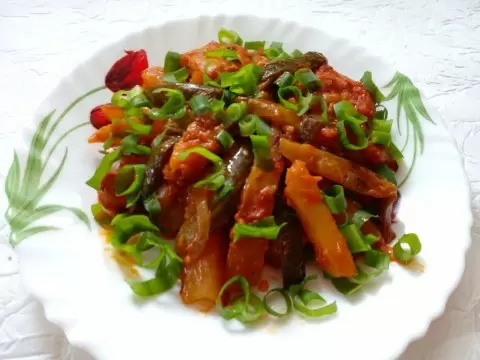 На сковороде нагревается новое порцию масла для обжарки репчатого лука. Как только лук становится мягким, в него добавляются нарезанные огурцы, и вся масса продолжает жариться в течение 15 минут. Затем томатная паста вводится в овощную смесь, и она тушится еще 10 минут.