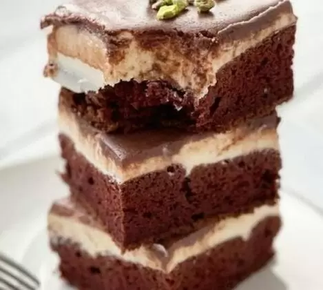 Когда брауни готов, его перекладывают обратно в форму, сверху равномерно распределяют остуженный крем и ставят в холодильник на час. Для глазури молоко доводят до кипения, затем добавляют масло и шоколад. После полного растворения глазури ее выкладывают поверх крема и оставляют в холодильнике еще на 20 минут. После этого вкусный десерт готов к нарезке и подаче.