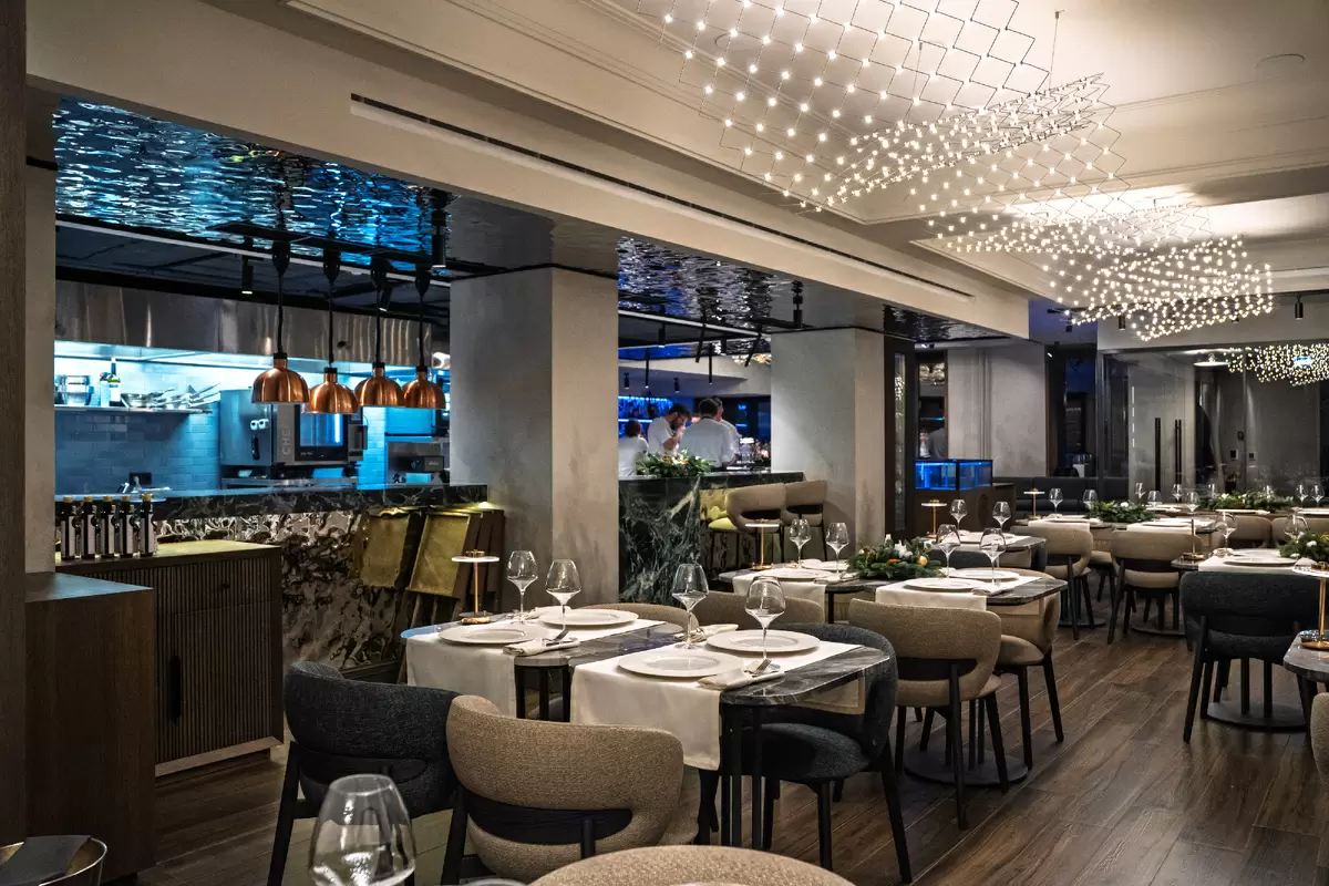 Essenza – это компактное пространство, включающее основной зал и просторную барную зону. Интерьер выполнен в классическом итальянском стиле, без лишних кричащих деталей, что создает атмосферу уважения к традициям кулинарной культуры Италии. В отделке использованы натуральные материалы: дерево, итальянский мрамор и металлические панели. Мягкие кресла приглашают гостей оставаться здесь подольше и насладиться трапезой, а меню располагает к этому более чем.
