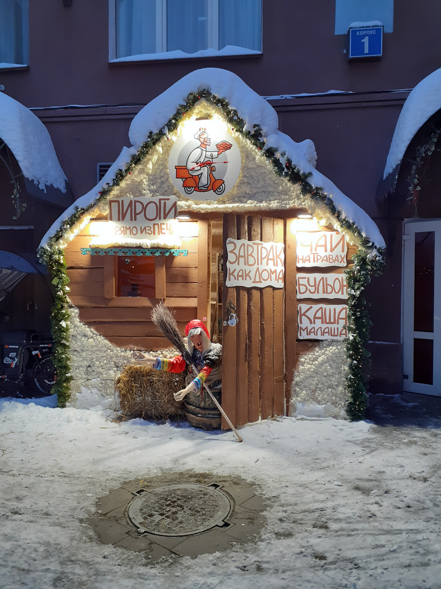 С первого взгляда из-за угла выглядывает колоритная избушка с Бабой Ягой, что, без сомнения, будоражит любопытство. Посетители знают, что этот персонаж всегда готов накормить и поделиться секретами русской кухни. Дверь приоткрыта, а вокруг множество узнаваемых фигурок из сказок, таких как домовенок Кузя и таинственная тень, возможно, Карабаса-Барабаса.