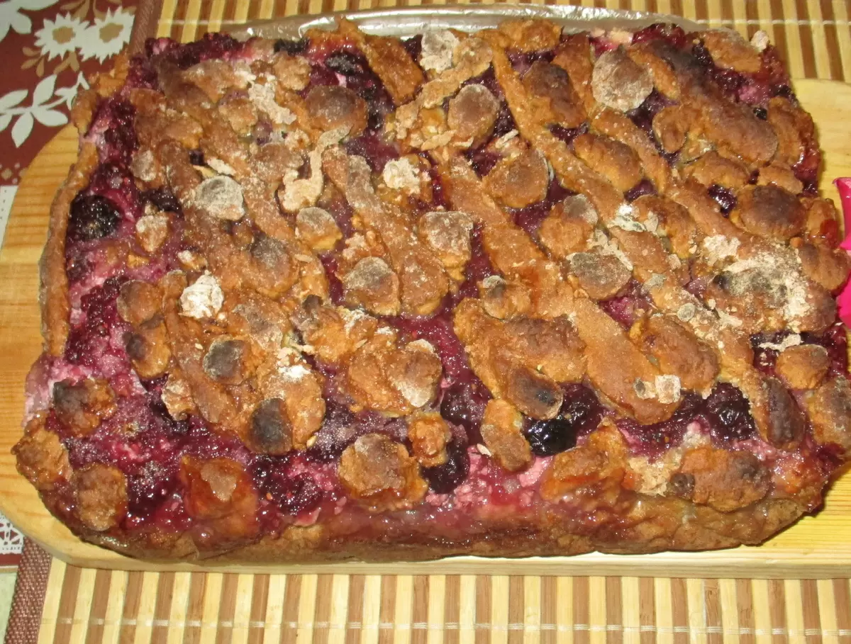 На готовое тесто выложить предварительно подготовленный творог, а сверху равномерно распределить смесь ягод, посыпав их сахаром. Часть теста оставляется для украшения пирога. Оставшиеся кусочки теста располагаются в виде стружки или небольших шариков сверху на ягодную начинку.