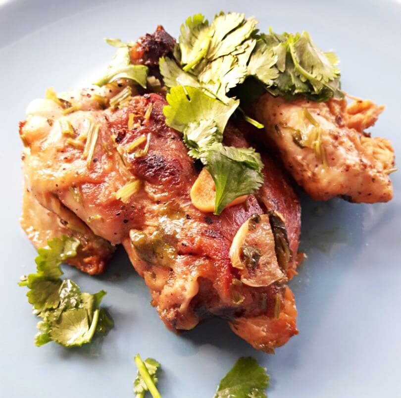 Чтобы придать блюду финальную нотку, мелко нарежьте кинзу и чеснок, стараясь делать кусочки достаточно крупными, чтобы избежать их подгорания. После этого добавьте кинзу с чесноком к курице, тщательно перемешайте и продолжайте тушить еще 15 минут.